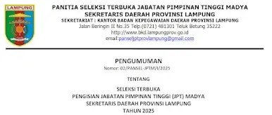Pengumuman seleksi ini berdasarkan Nomor: 02/PANSEL-JPTM/I/2025 dan ditujukan kepada seluruh Pegawai Negeri Sipil (PNS) yang memenuhi persyaratan untuk mendaftar.